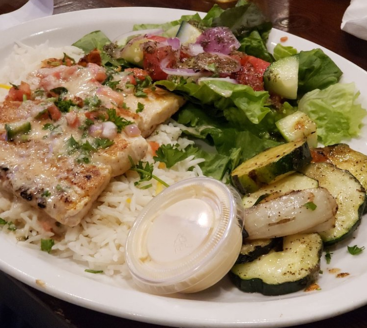 Chicken kabob, filet mignon kabob and five large grilled shrimp. Served with basmati rice, grilled veggies, salad, hummus, tzatziki & pita bread. Shrimp topped with pico de gallo and mojo sauce.