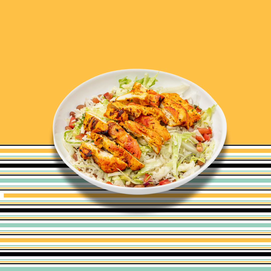 All white-meat grilled chicken. Rice, pinto beans, lettuce, pico de gallo and jack cheese.