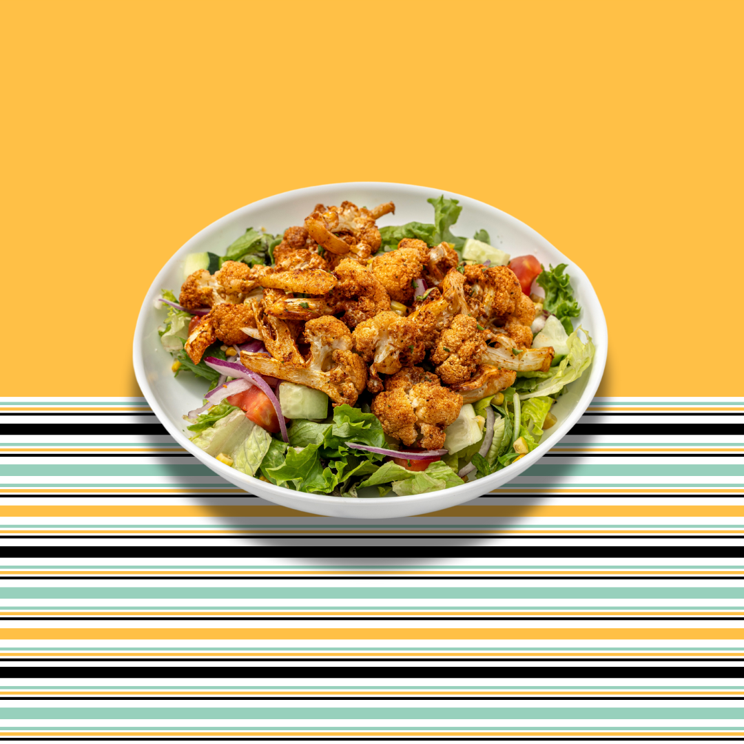 Vegetarian. Organic fried cauliflower, served with basmati rice, grilled veggies and salad.