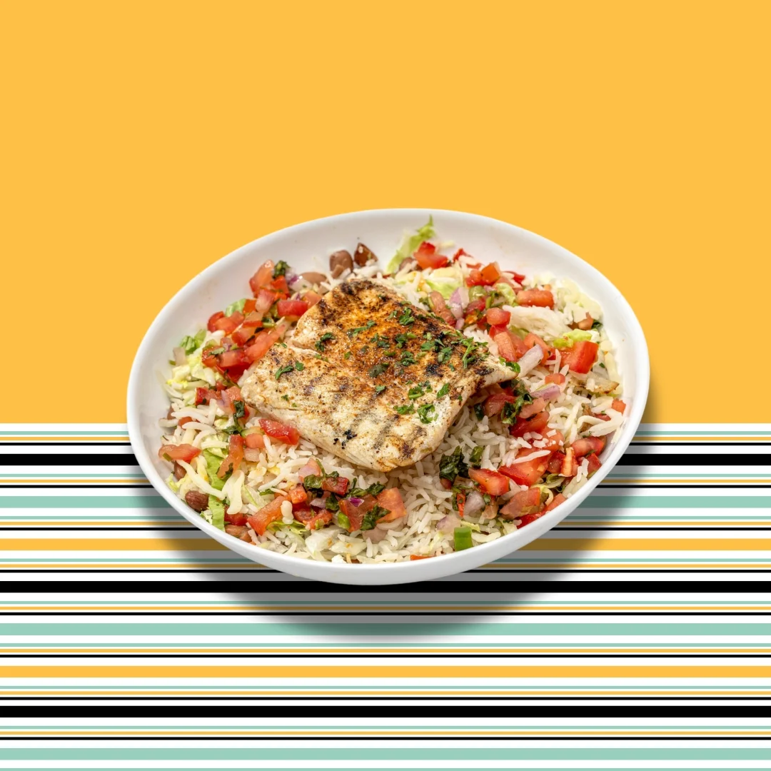 Grilled mahi-mahi, served with basmati rice, grilled veggies and salad. Topped with mojo sauce and pico de gallo.