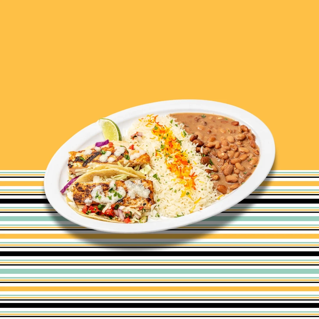 Two grilled mahi-mahi tacos on corn tortillas served with rice and beans. Toppings: Cabbage, garlic sauce, pico de gallo, jack cheese and mojo sauce.