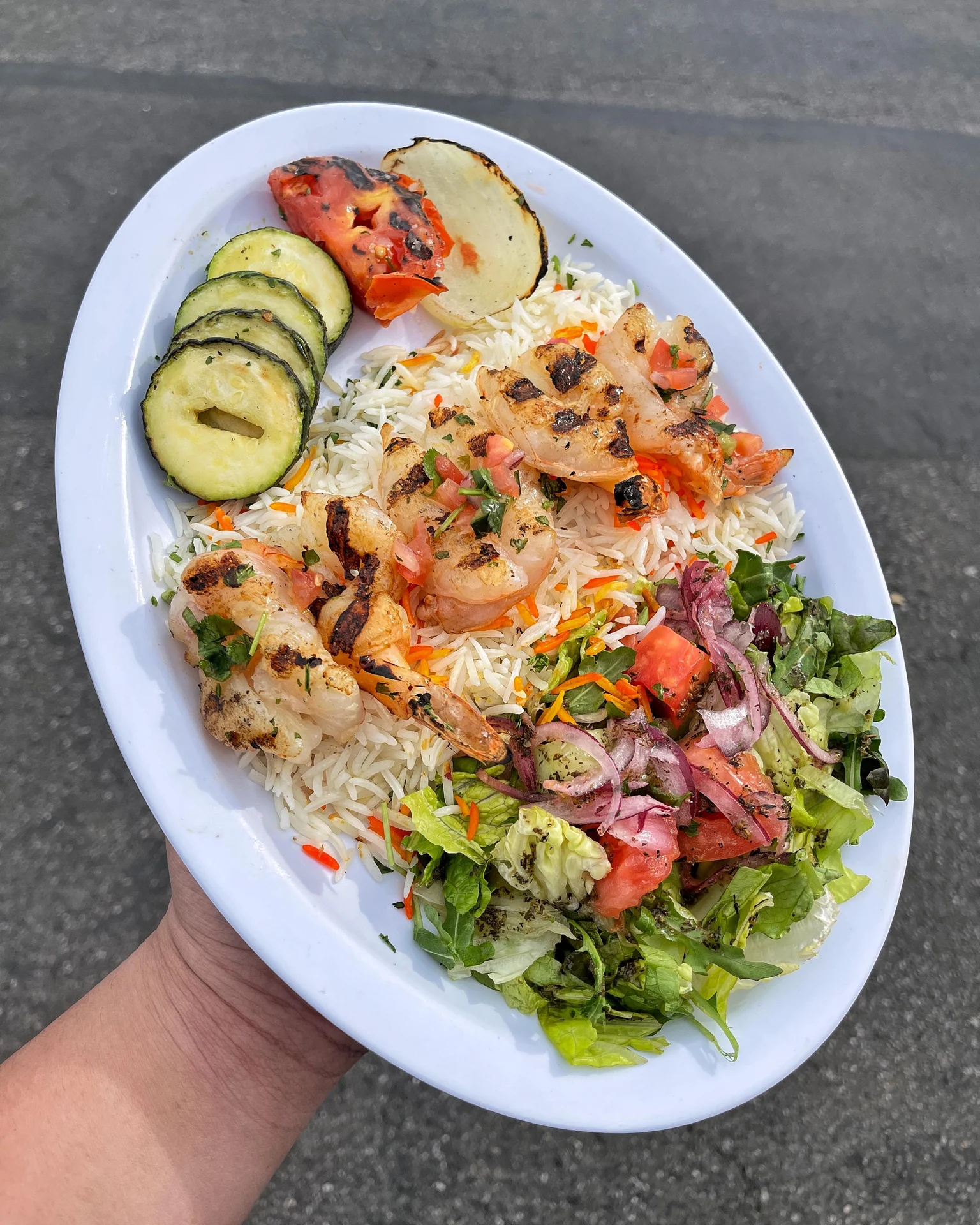 5pcs grilled large shrimp, served with basmati rice, grilled veggies and salad.