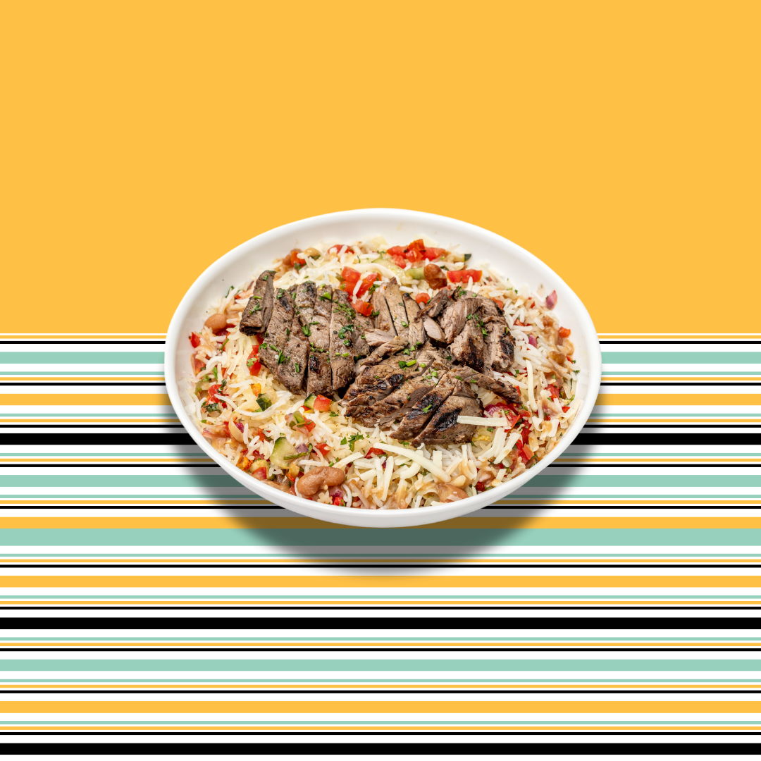 Filet mignon steak. Rice, pinto beans, lettuce, pico de gallo and jack cheese.