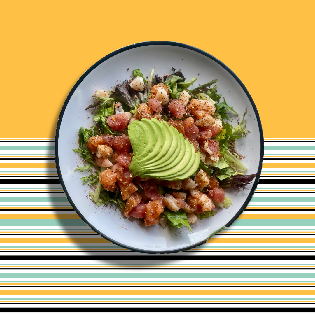 Sushi grade ahi tuna & salmon, shrimp, mixed greens, ponzu & sesame seeds