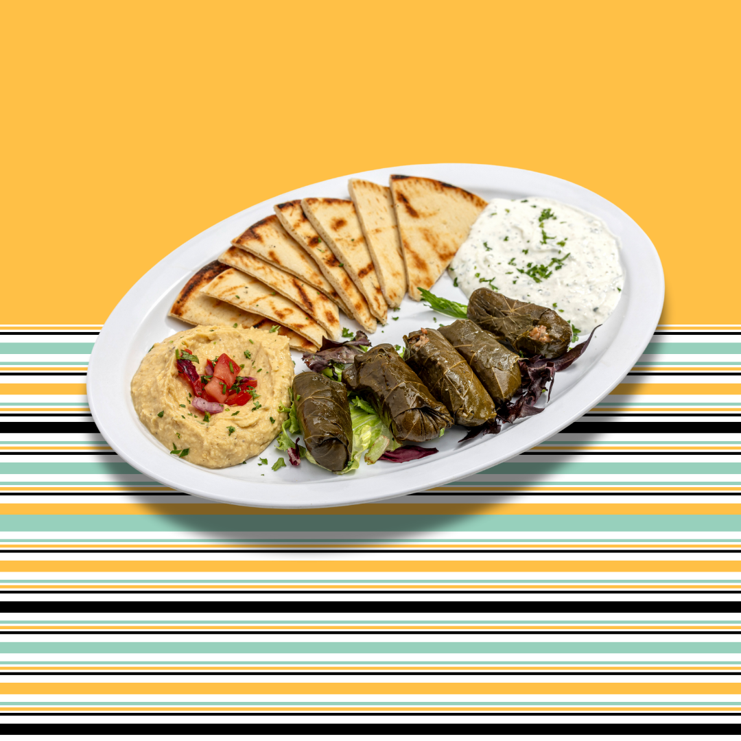 5 pieces of stuffed vegetarian grape leaves served with hummus, tzatziki and grilled pita.