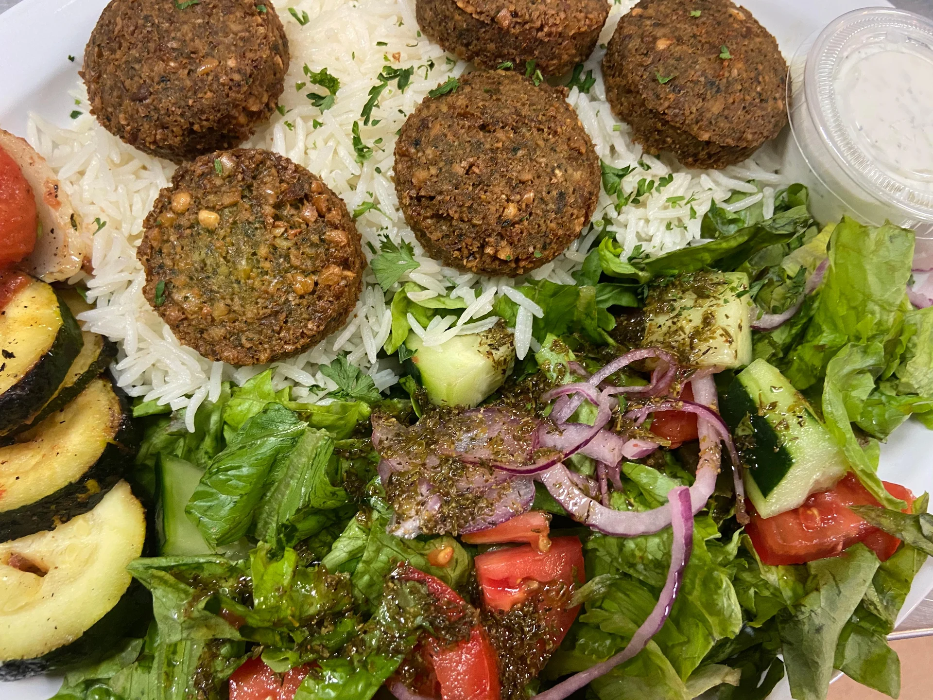 Vegetarian. Five fried falafel patties (ground chickpeas and veggies) made in-house. Served with basmati rice, grilled veggies and salad.