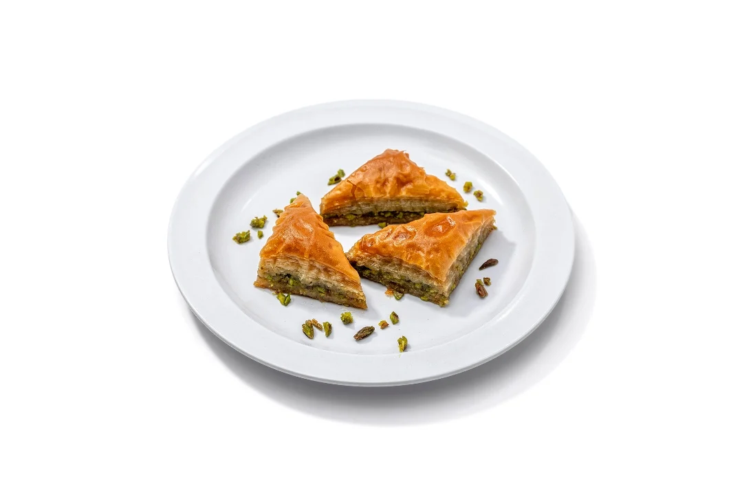 Layered crunchy phyllo dough filled with pistachios and baked with a sweet rosewater & cardamom syrup
