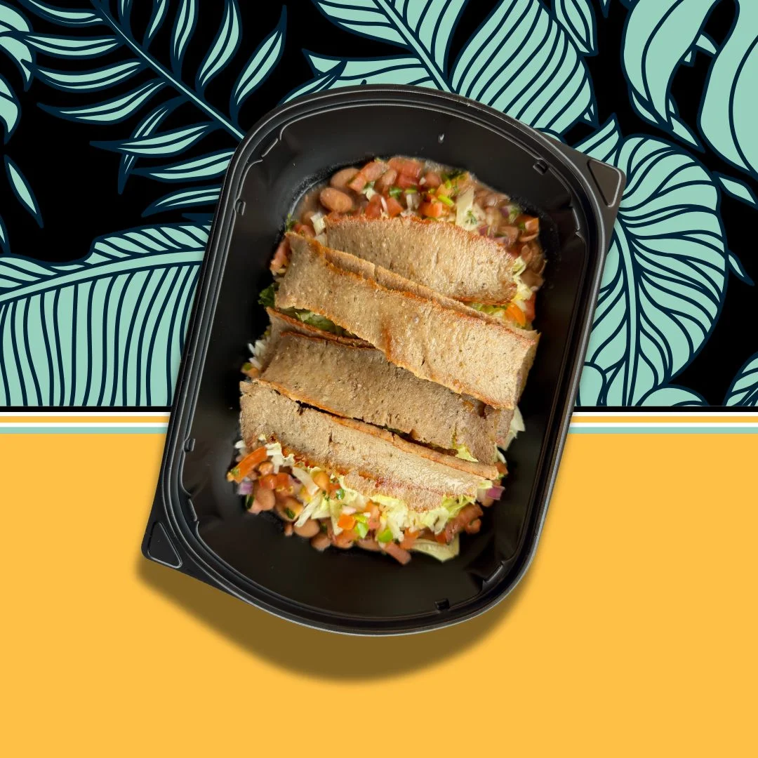 Five large grilled shrimp, grilled salmon and barramundi (Asian seabass). Served with basmati rice, beans, salad, tortillas, grilled veggies & topped with mojo sauce and pico de gallo.