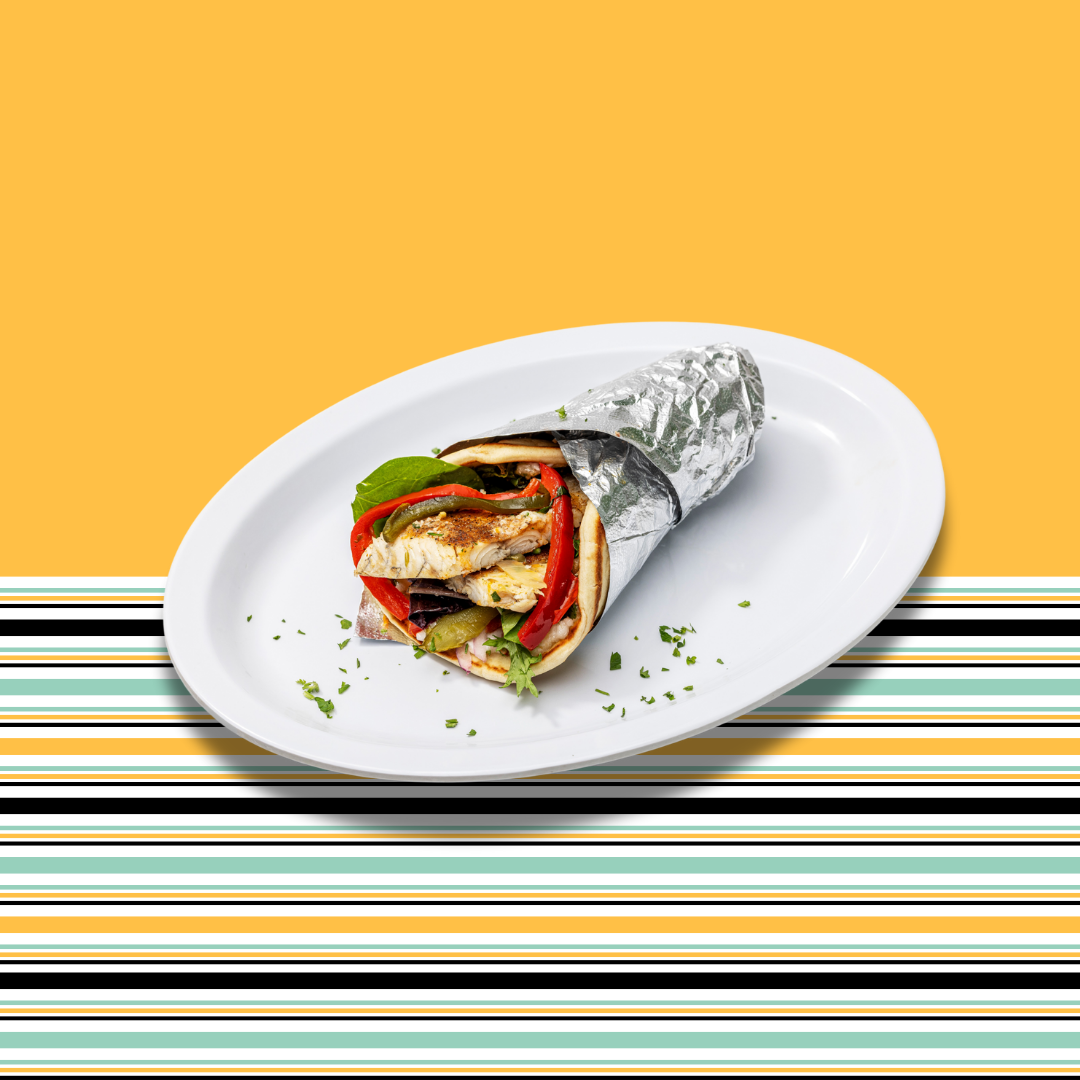 Grilled mahi-mahi. Wrapped with mixed greens, tomatoes, red onions, pickles, garlic sauce, pico de gallo and mojo sauce.