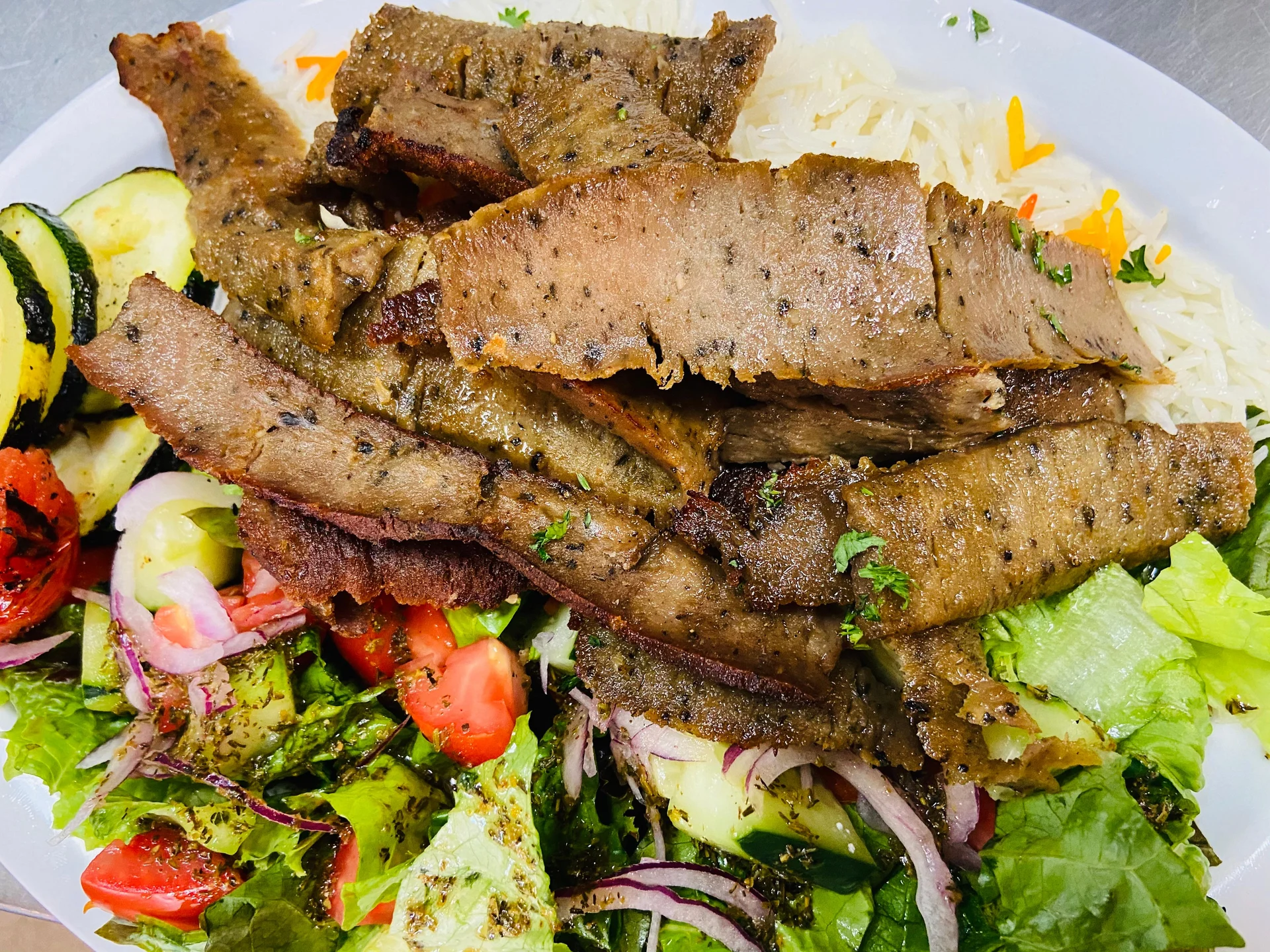 Lamb gyro meat cooked and sliced off a vertical grill. Served with basmati rice, grilled veggies and salad.