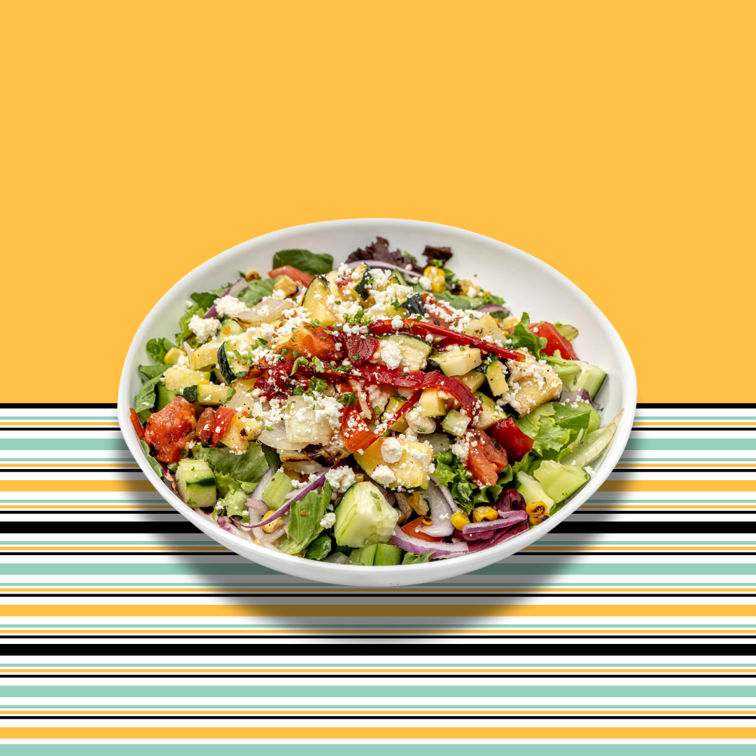 Vegetarian. Greek feta cheese, onions, zucchini, tomatoes, roasted red pepper. Served on pinto beans, lettuce, pico de gallo and jack cheese.
