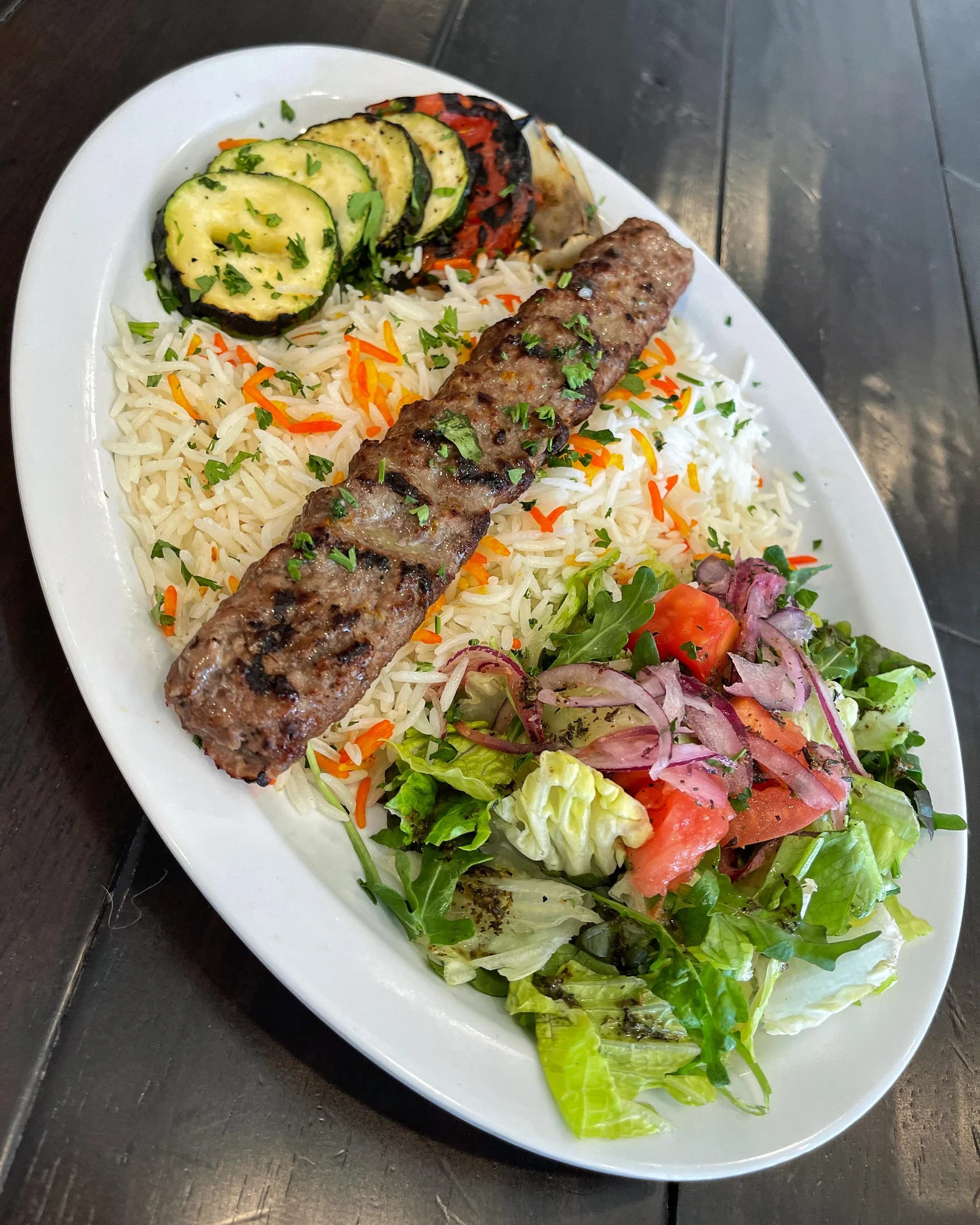 Three kabobs; filet mignon, chicken & ground sirloin. Served with basmati rice, grilled veggies, salad, hummus, tzatziki & pita bread.