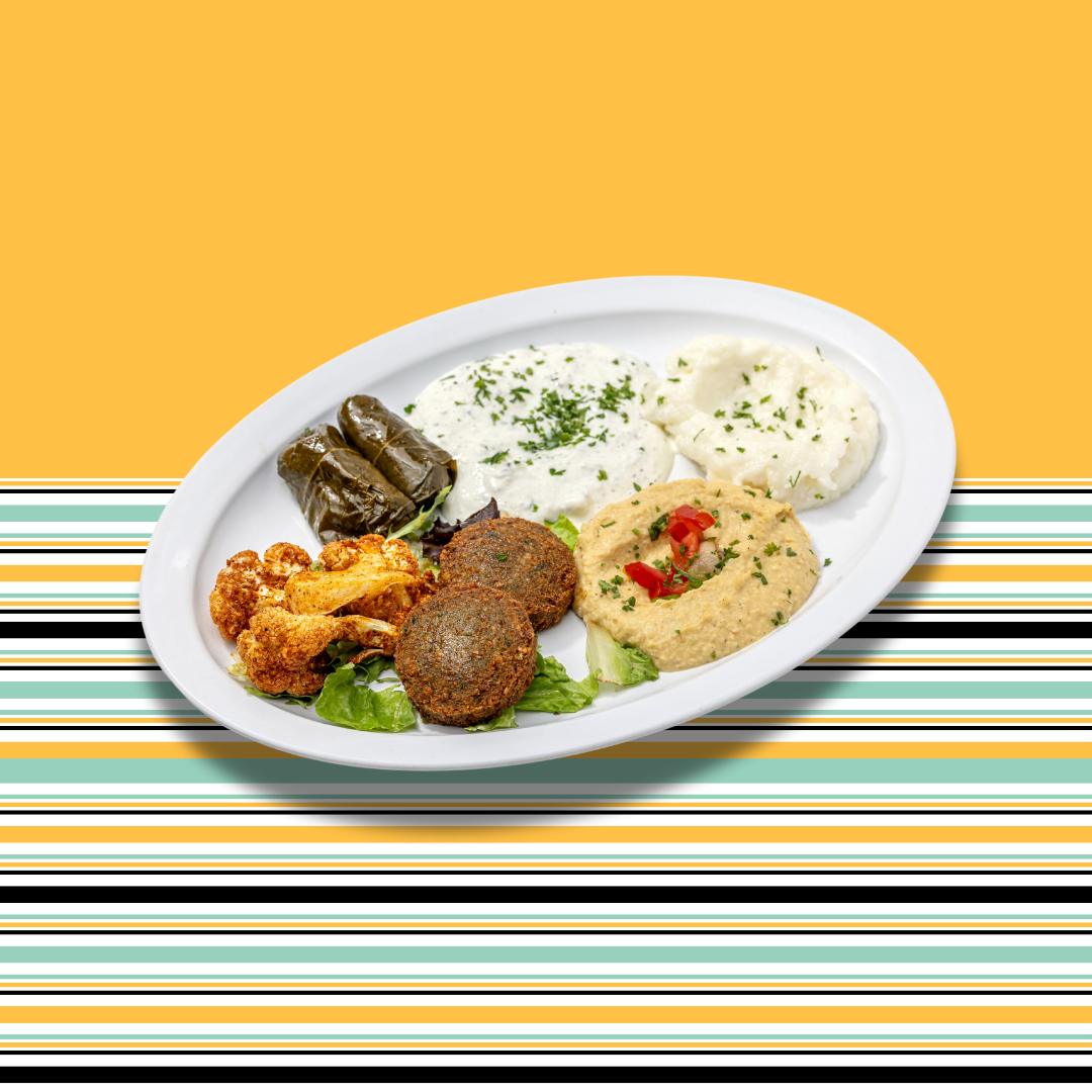 Perfect for sharing! A Combination of our Mediterranean appetizers. Includes: Hummus, tzatziki, garlic sauce, falafel, dolma (stuffed vegetarian grape leaves), fried organic cauliflower and grilled pitas.