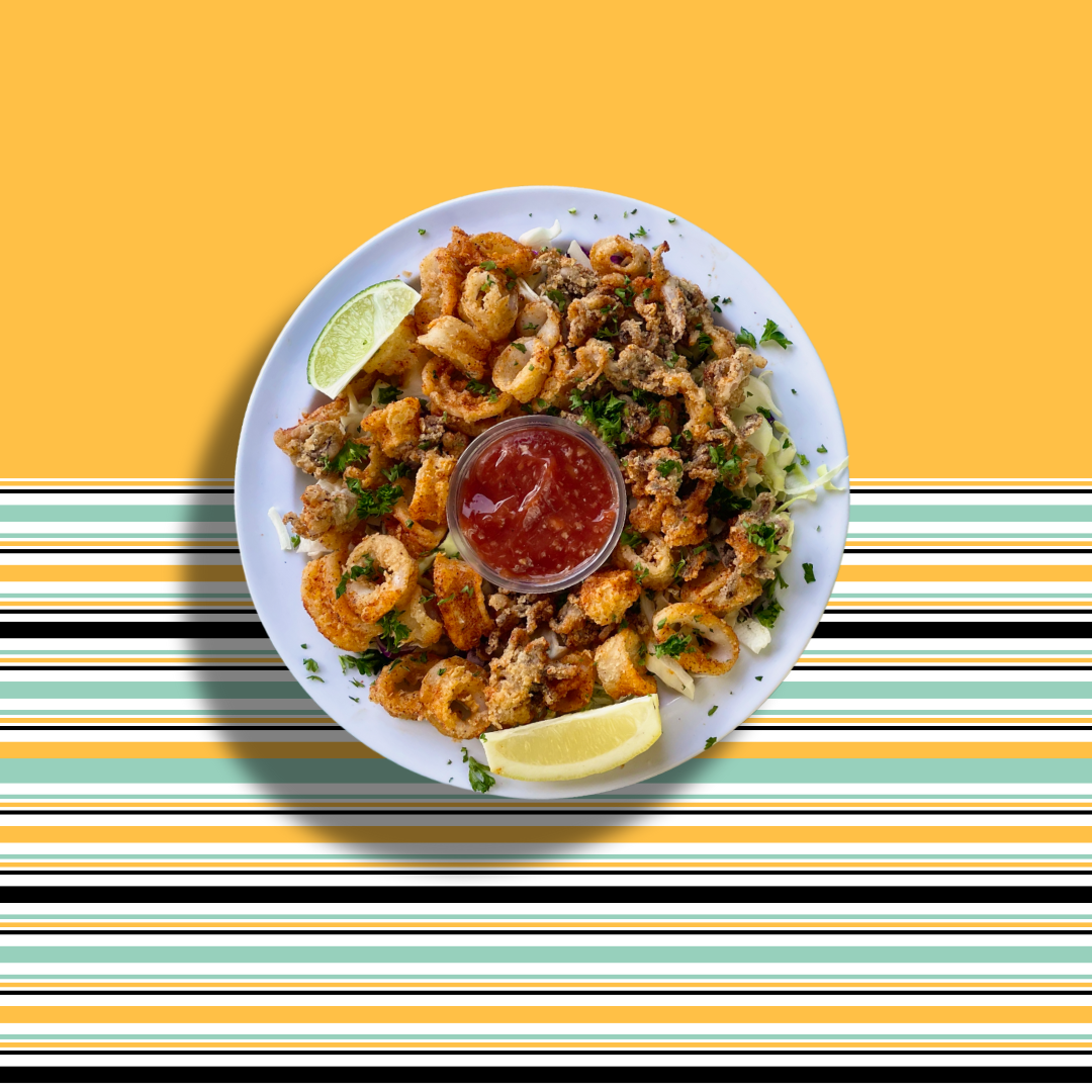 5pcs battered large shrimp, served with basmati rice, grilled veggies and salad. Topped with mojo sauce and pico de gallo.