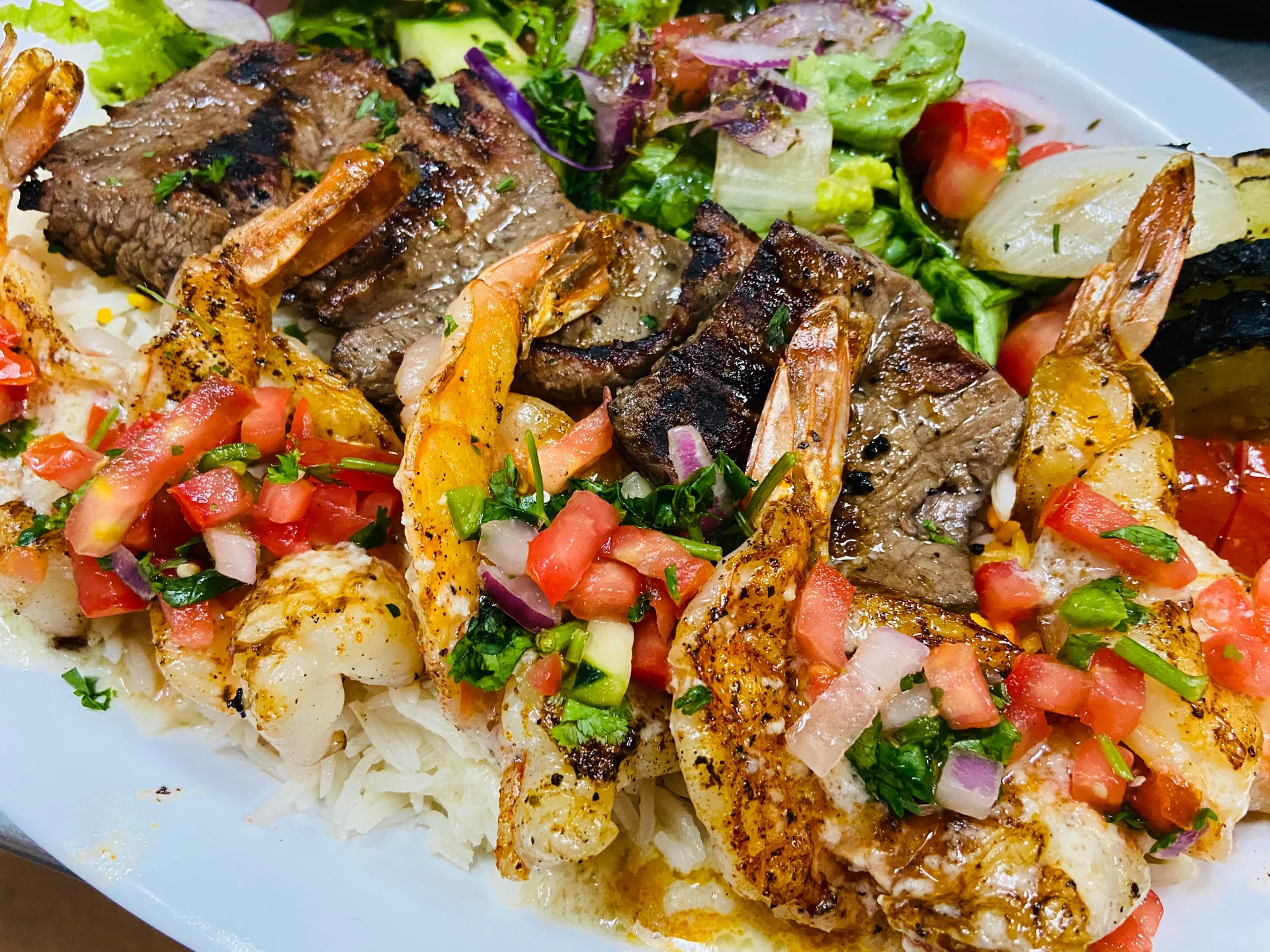 One filet-mignon steak kabob and five grilled large shrimp. Served with basmati rice, grilled veggies and salad. Shrimp topped with pico de gallo and mojo sauce.