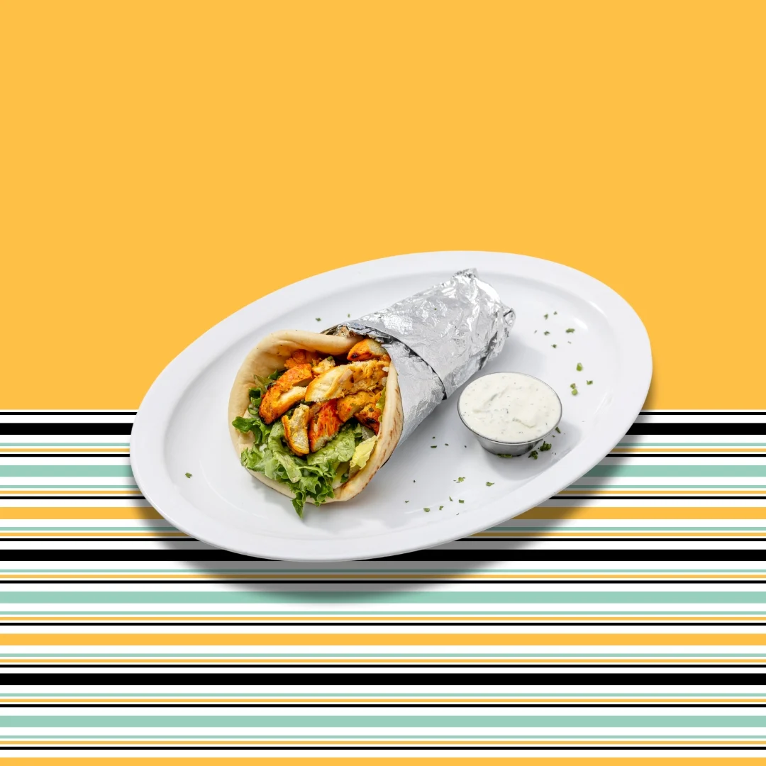 All white meat chicken kabob. Wrapped with mixed greens, tomatoes, red onions, pickles and garlic sauce.