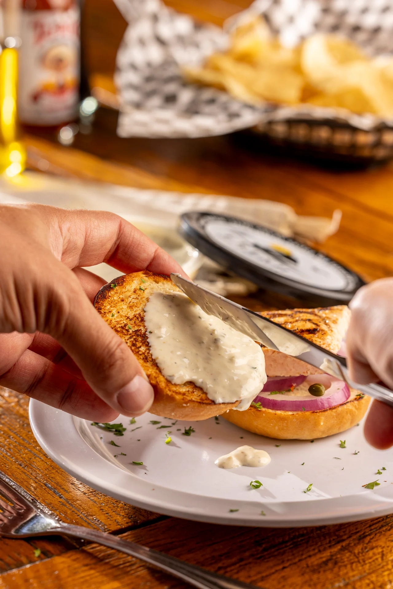Angus sirloin ground in-house. Wrapped with mixed greens, tomatoes, red onions, pickles and garlic sauce.