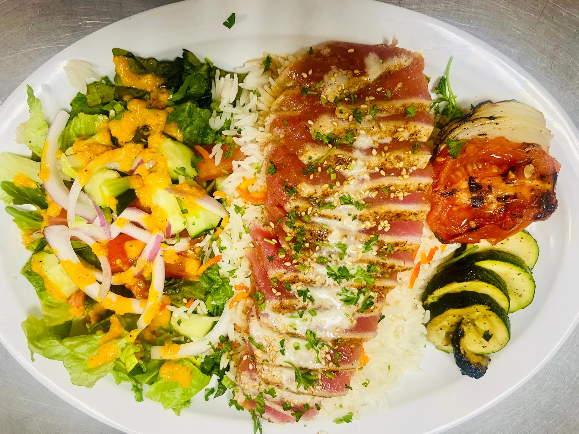 Seared sushi grade ahi tuna, served with basmati rice, grilled veggies and soy-ginger salad. Topped with mojo sauce, ponzu and roasted sesame seeds..
