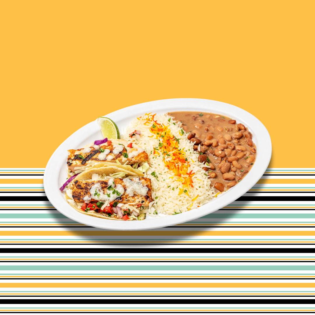Best when consumed for dine-in. Two grilled Asian seabass tacos on corn tortillas served with rice and beans. Toppings: Cabbage, garlic sauce, pico de gallo, jack cheese, Veracruzano and mojo sauce.