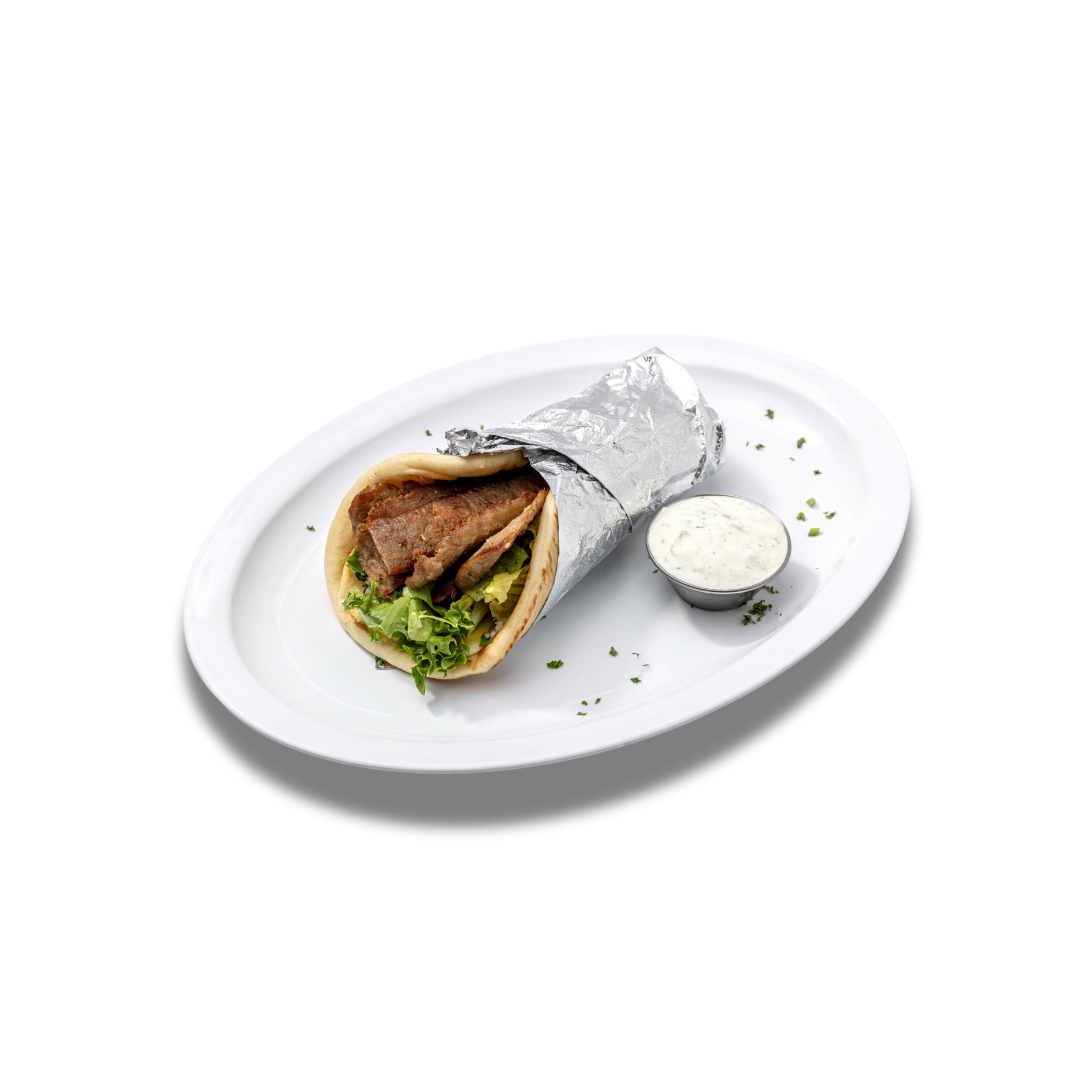 Lamb gyro cooked and sliced off a vertical grill. Wrapped with mixed greens, tomatoes, red onions, pickles and garlic sauce.