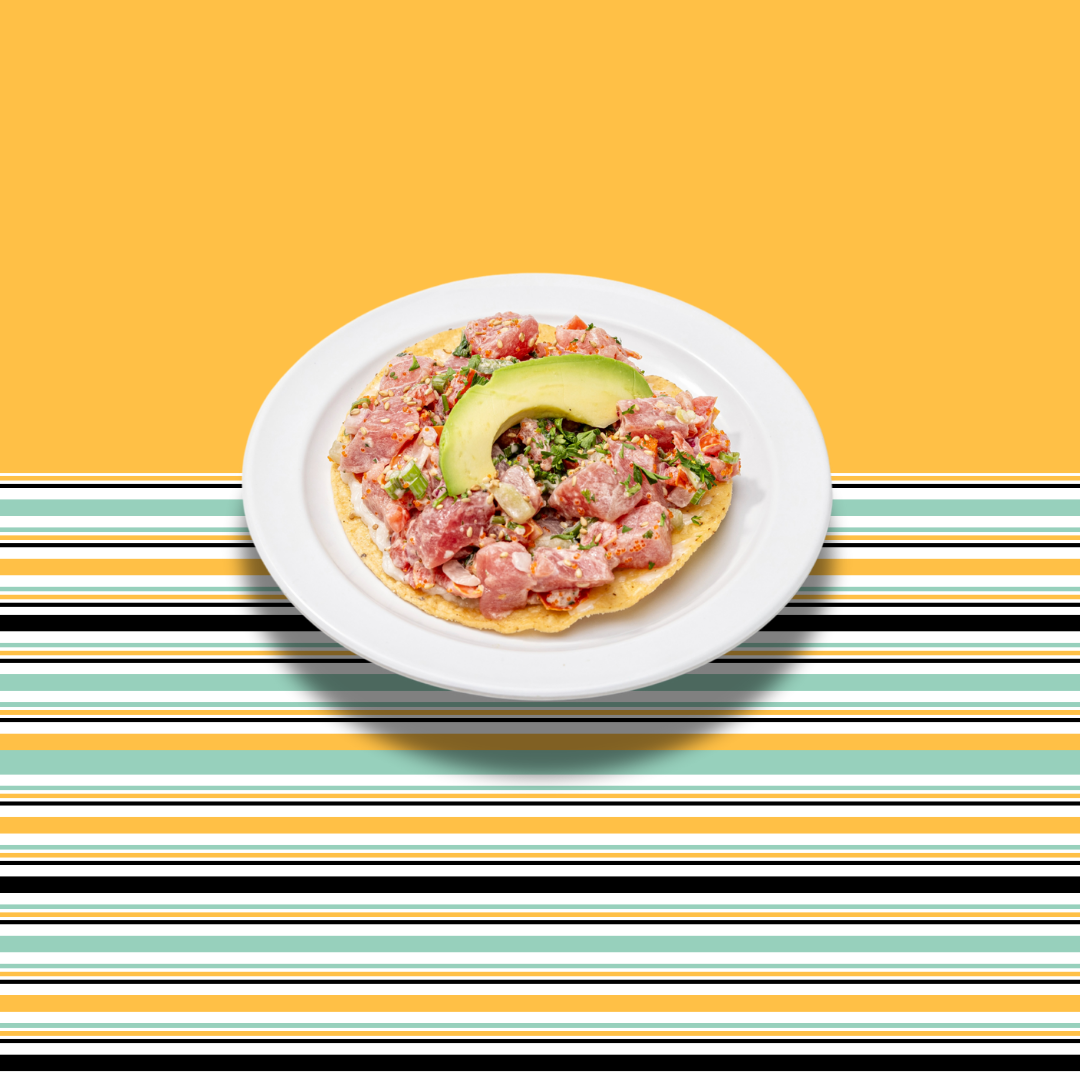 Sushi grade ahi tuna, tossed with pico de gallo, topped with avocado. Served on a tostada