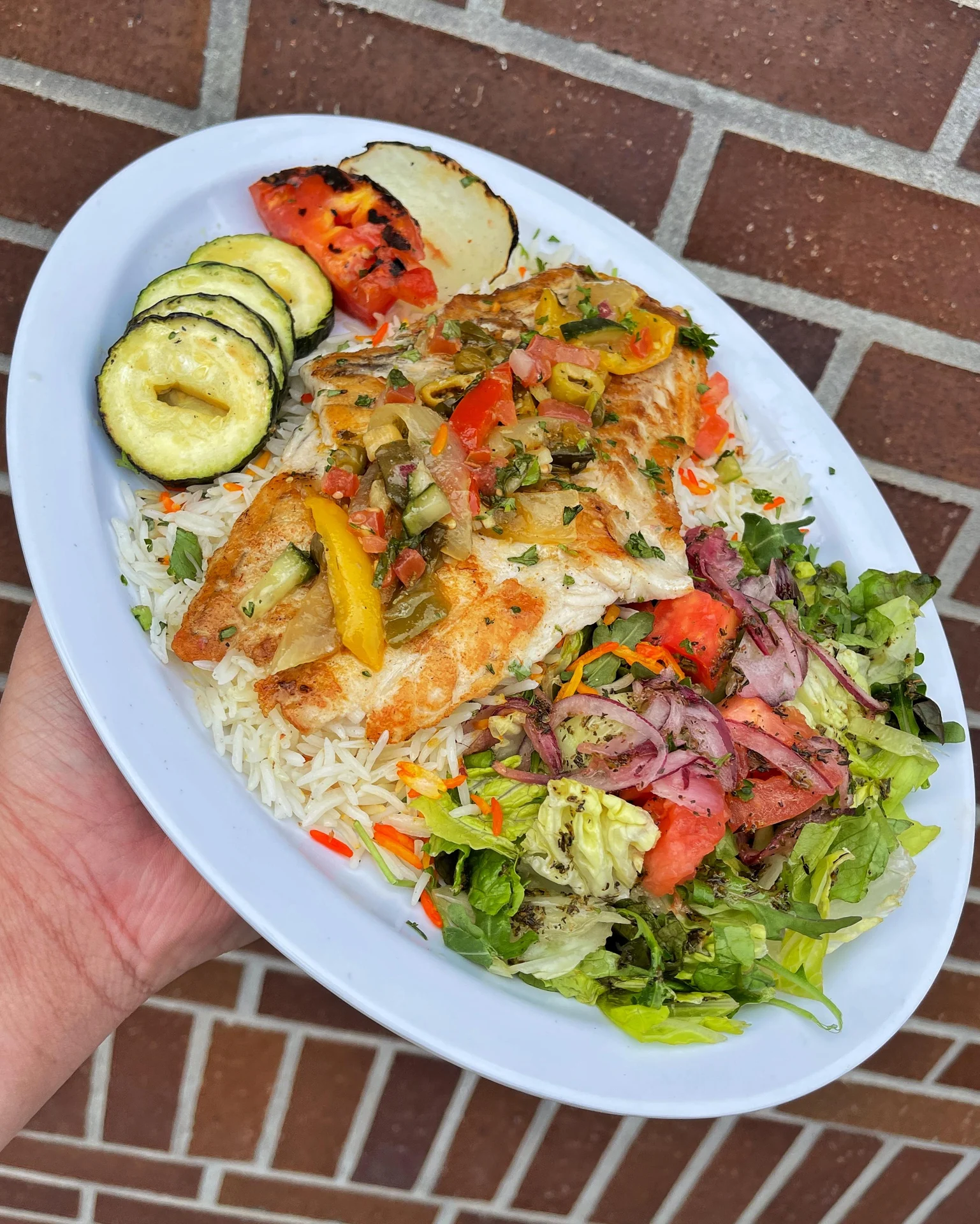 Grilled Asian seabass, served with basmati rice, grilled veggies and salad. Topped with mojo sauce, Veracruzano and pico de gallo.