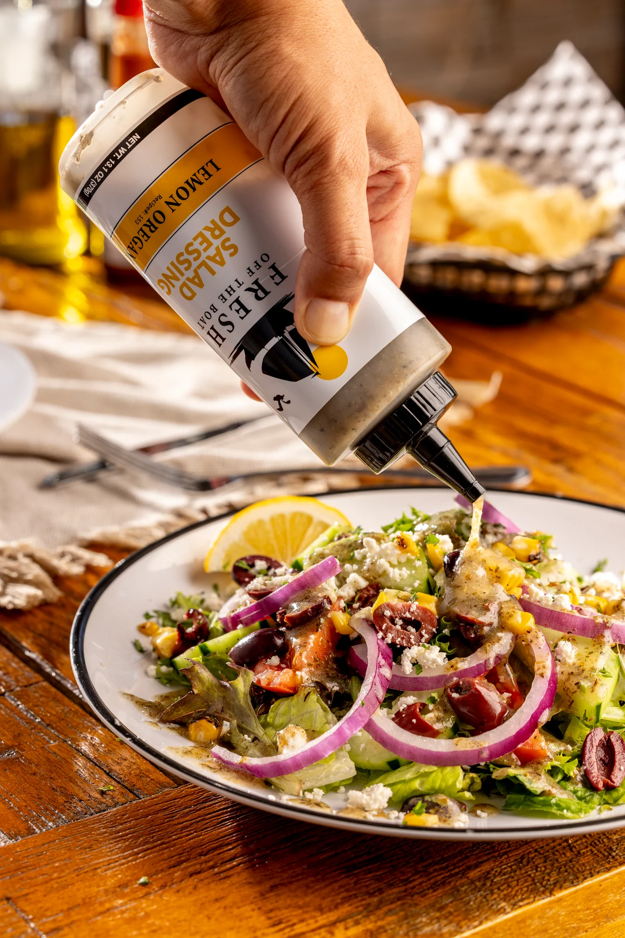 Sushi-grade seared ahi tuna. Wrapped with mixed greens, tomatoes, red onions, pickles, garlic sauce, ponzu and mojo sauce.
