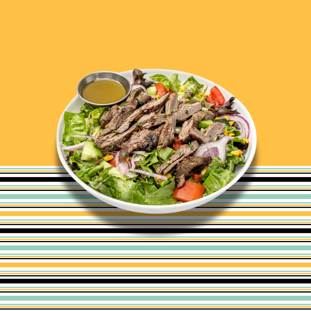 Filet-mignon steak. Wrapped with mixed greens, tomatoes, red onions, pickles and garlic sauce.