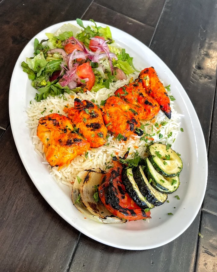 White meat chicken kabob. Served with basmati rice, grilled veggies and salad.