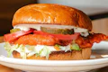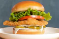Crispy chik'n filet, dill pickles, lettuce, tomato and house-made lemon-herb mayo on a brioche bun. | 15g protein. | 5g fiber | Contains: Soy, Gluten, Garlic, Seeds, Coconut