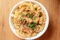 Organic pasta in truffle cheese sauce with mushroom crisps, almond parmesan and toasted breadcrumbs. | 17g protein | 8g fiber | Contains: Soy, Gluten, Garlic, Tree Nuts, Seeds, Coconut |