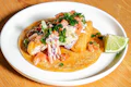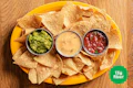Crisp, fresh-fried organic tortilla chips served with house-made queso, house-made guacamole, and salsa roja. | 9g protein | 13g fiber | Contains: Soy, Garlic, Seeds, Coconut