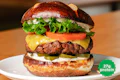 House-seasoned 1/4 lb Beyond™ patty, crispy onion rings, organic tempeh bacon, dill pickles, choice of cheese, hickory BBQ and house-made special sauce on a toasted pretzel bun. | 34g protein | 4g fiber | Contains: Soy, Gluten, Garlic, Seeds, Coconut